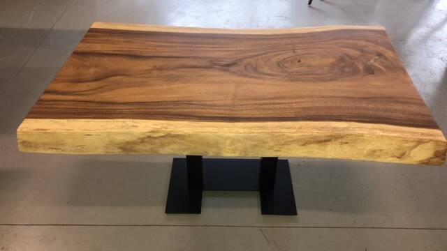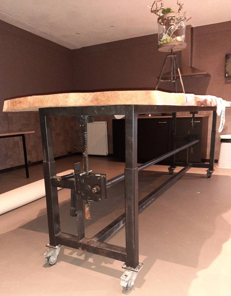 Verstelbare tafel van suar hout boomstamblad en metaal zwart gepoedercoat onder stel.