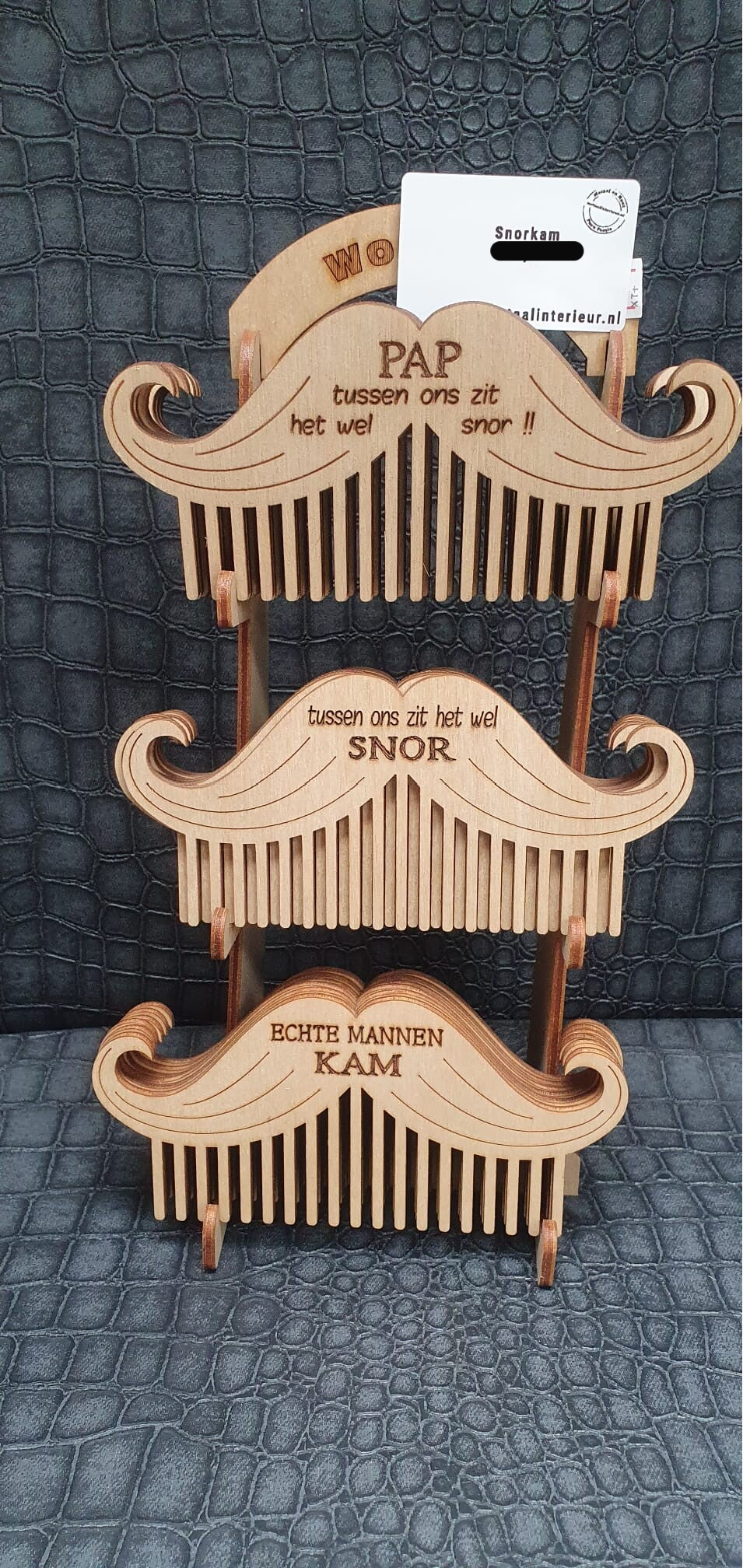 Houten Snorkam met de teksten