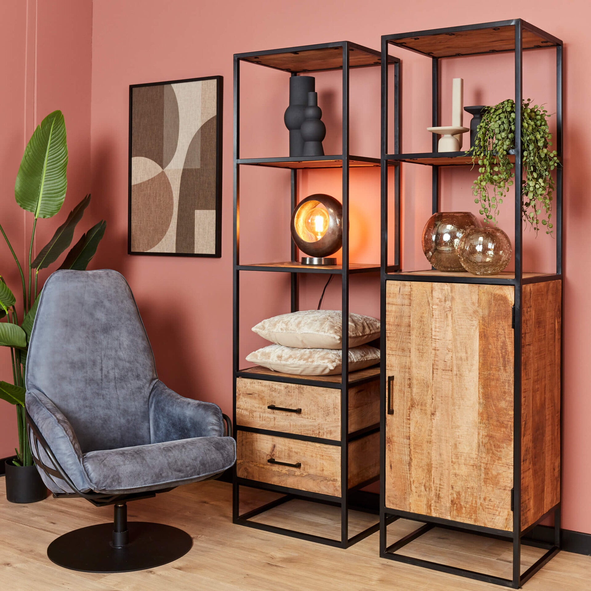 - Het mangohout is afgelakt en het metaal is zwart gepoedercoat