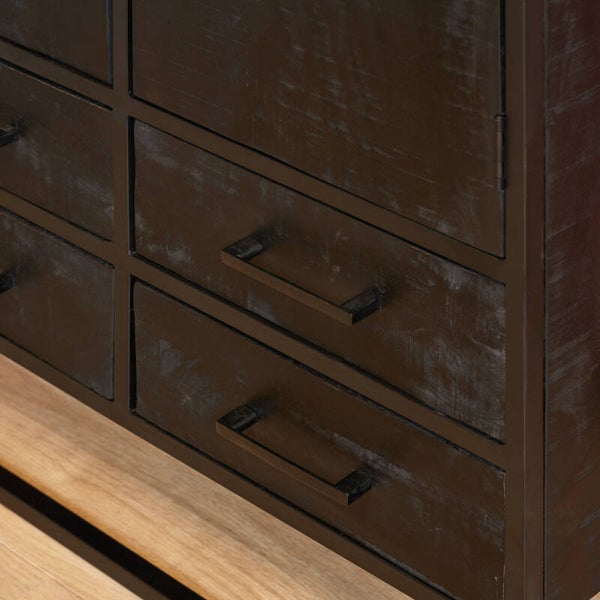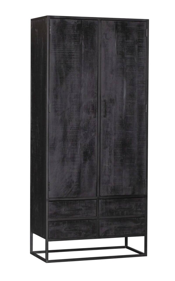 Deze kabinet kast uit onze Denver Black serie heeft vier lades en twee deuren en is uitgevoerd in massief mangohout. Achter de twee lange deuren vind je nog drie extra legplanken. Het frame en de handgrepen zijn gemaakt van metaal en afgewerkt met een zwarte lak. Het mangohout is behandeld met een zwarte lak.