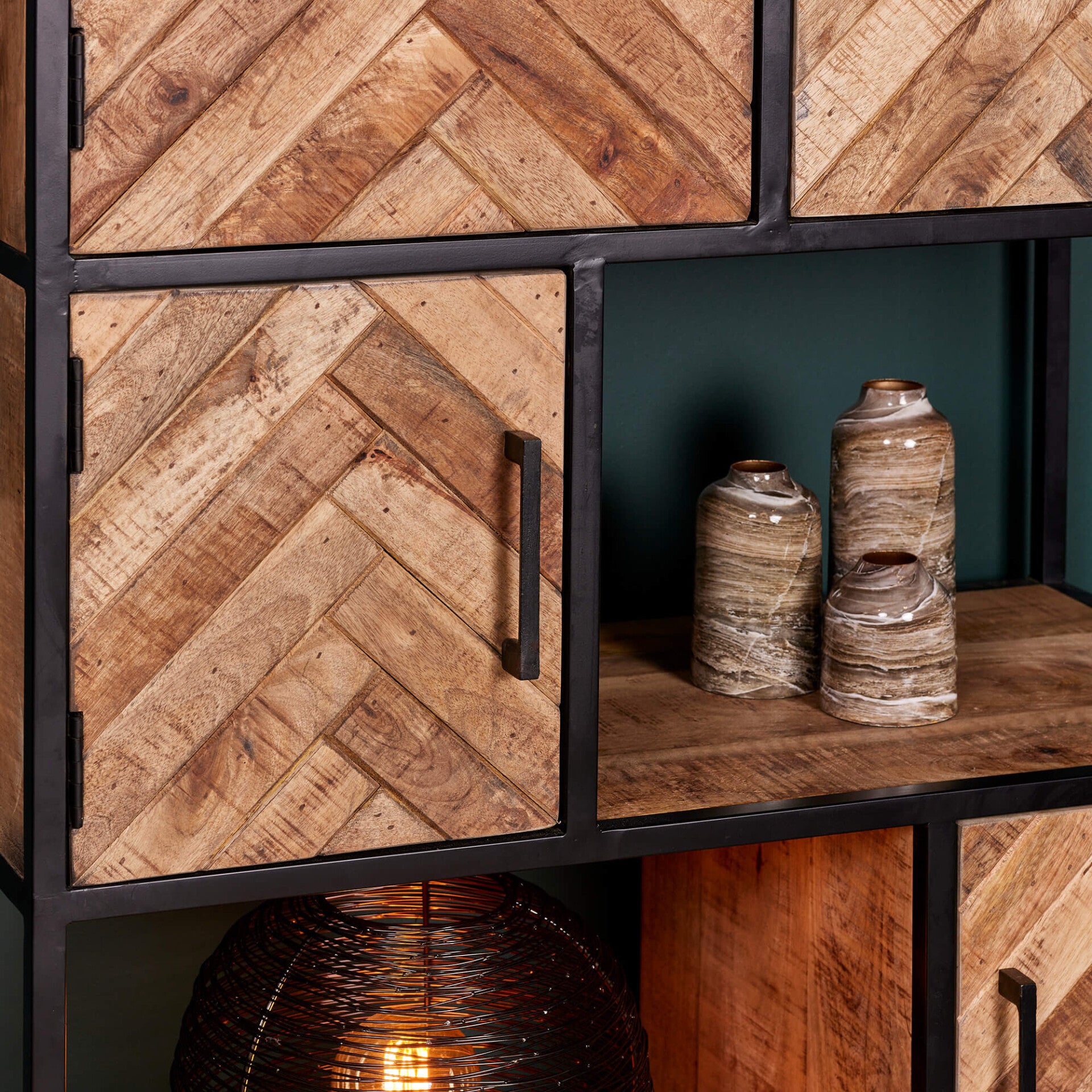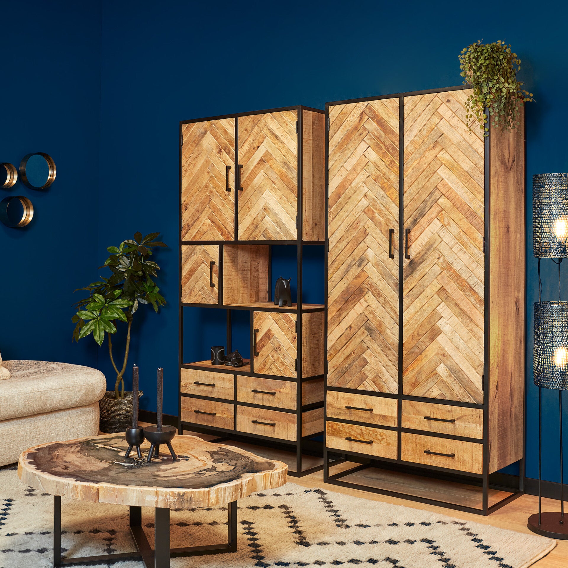 Deze vakkenkast uit onze ‘Arlington serie’ heeft vier lades, vier deuren en twee vakken en is uitgevoerd in een visgraatpatroon. Achter de twee lange deuren vind je nog een extra legplank. De vakkenkast is gemaakt van mangohout en is afgewerkt met een lak. Het frame en de handgrepen zijn gemaakt van metaal en afgewerkt met een zwarte lak.