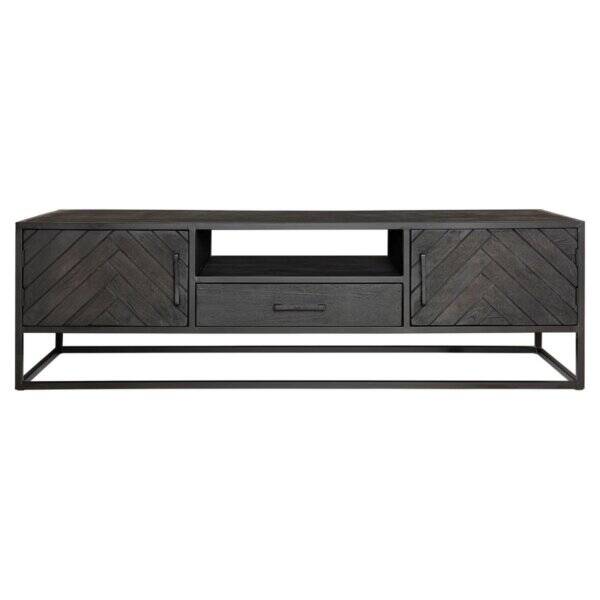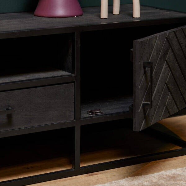 Tv meubel ‘New York’ is gemaakt van gezandstraald mangohout. Het metalen frame en de metalen handgrepen zijn afgewerkt met een zwarte lak. Dit model is voorzien van één deuren en een open vak met legplank. Het hout is ingelegd in een visgraatpatroon en is afgewerkt met een zwarte lak.