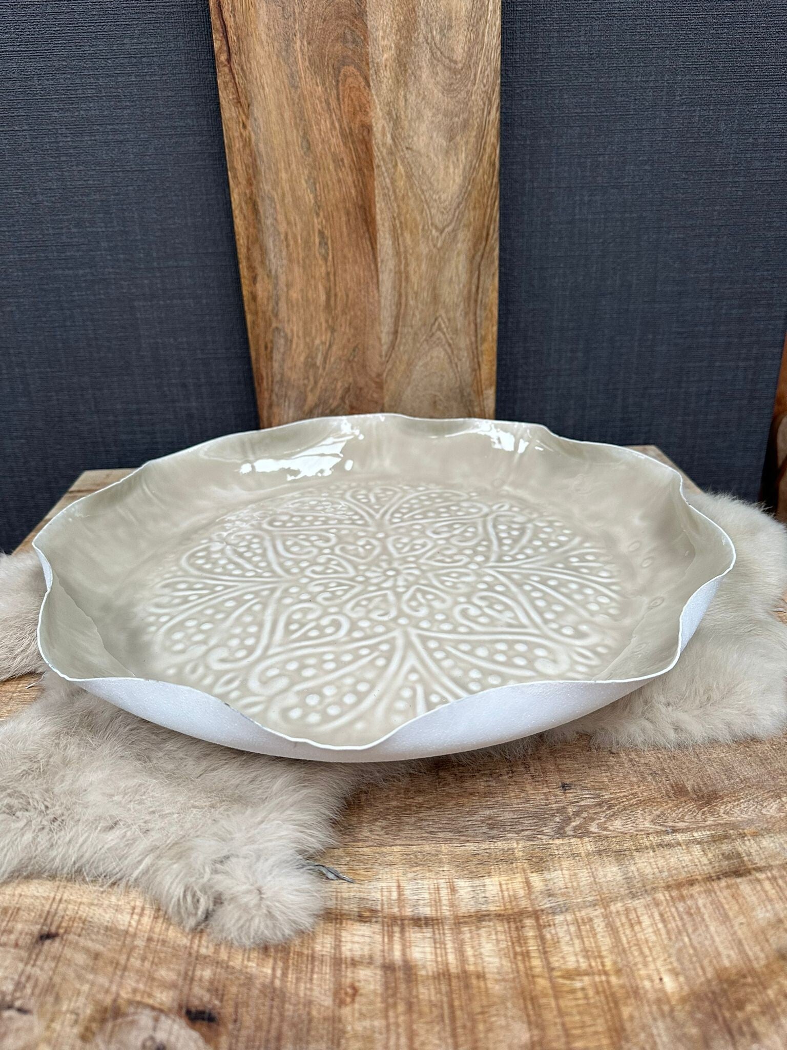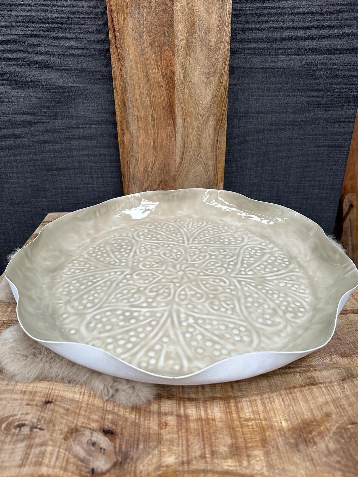 Mooi bewerkte zilver grijzen schaal met opstaande rand. de rand is zilver de bodem mooi bewerkt.