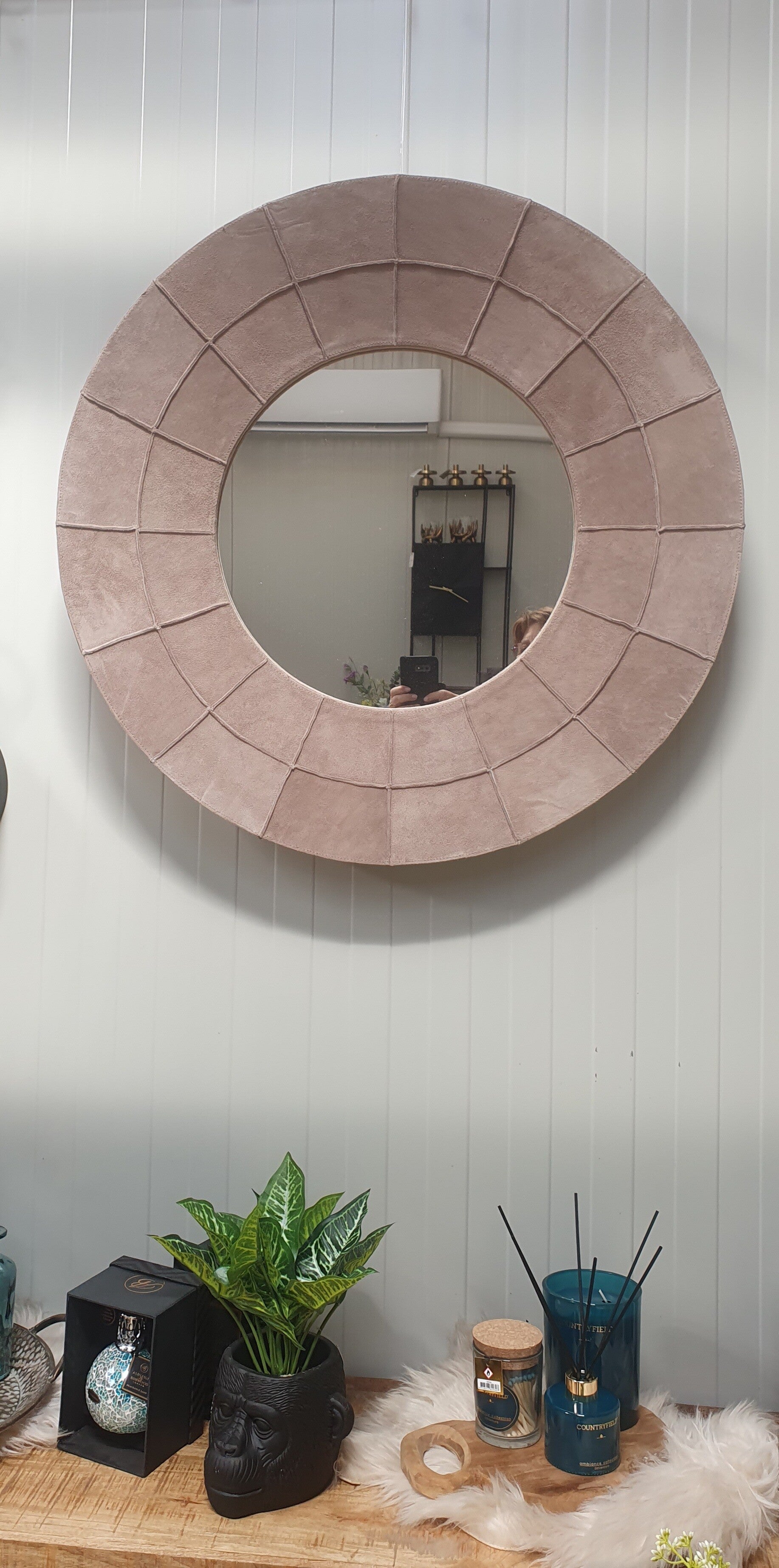 Wandspiegel Brenn is van het merk PTMD. De rand is met een beige lederen suede rand bekleed.