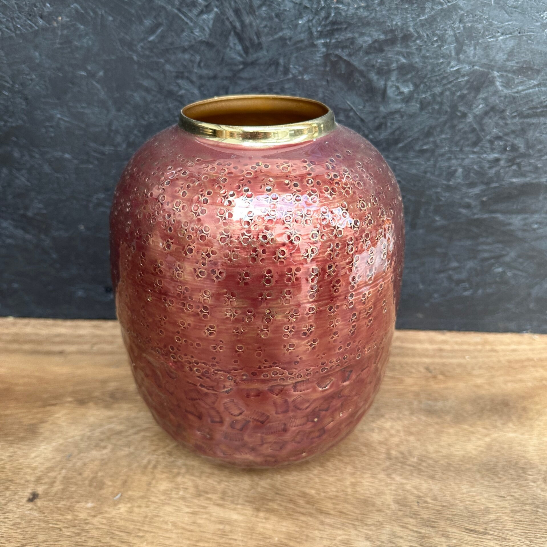 Geef jouw interieur een warme, stijlvolle touch met deze metalen vazen in aardetinten. De set bestaat uit drie handgehamerde vazen in crème, roestrood en koperkleur, elk met een uniek patroon en een luxe gouden binnenrand. Perfect als decoratief accent op een dressoir, tafel of vensterbank – met of zonder bloemen. Deze metalen vazen zijn niet alleen een echte blikvanger, maar ook ideaal te combineren in een modern of industrieel interieur