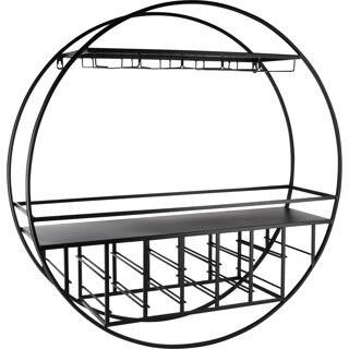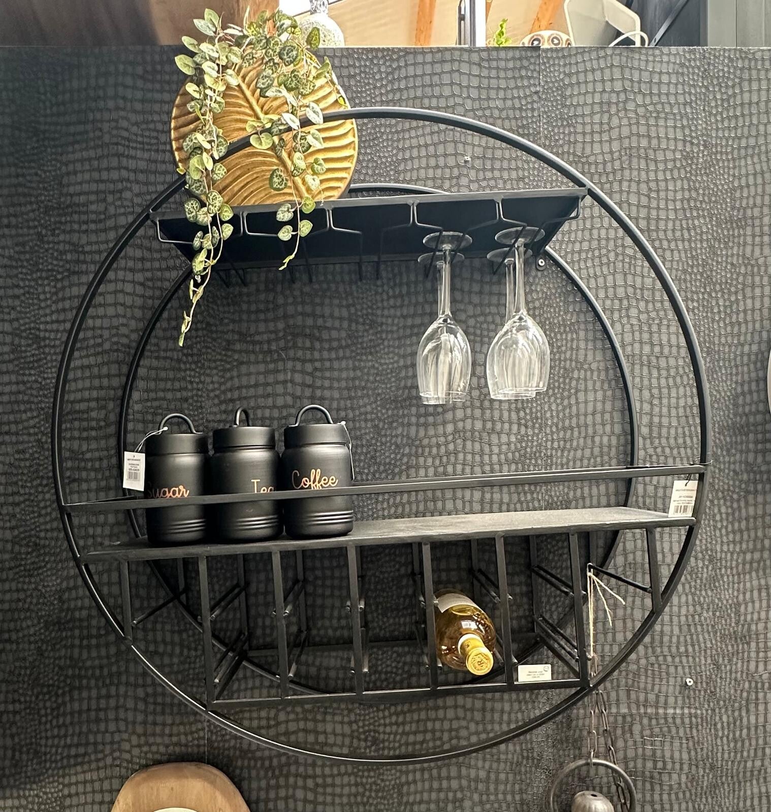 Dit ronde wijnrek van zwart metaal (Ø80x23 cm) is een echte eyecatcher voor elke wijnliefhebber. Het biedt ruimte voor wijnflessen, glazen én accessoires – alles overzichtelijk en stijlvol gepresenteerd. Perfect voor in de keuken, woonkamer of wijnhoek. Dankzij het moderne, industriële design past het rek in elk interieur.