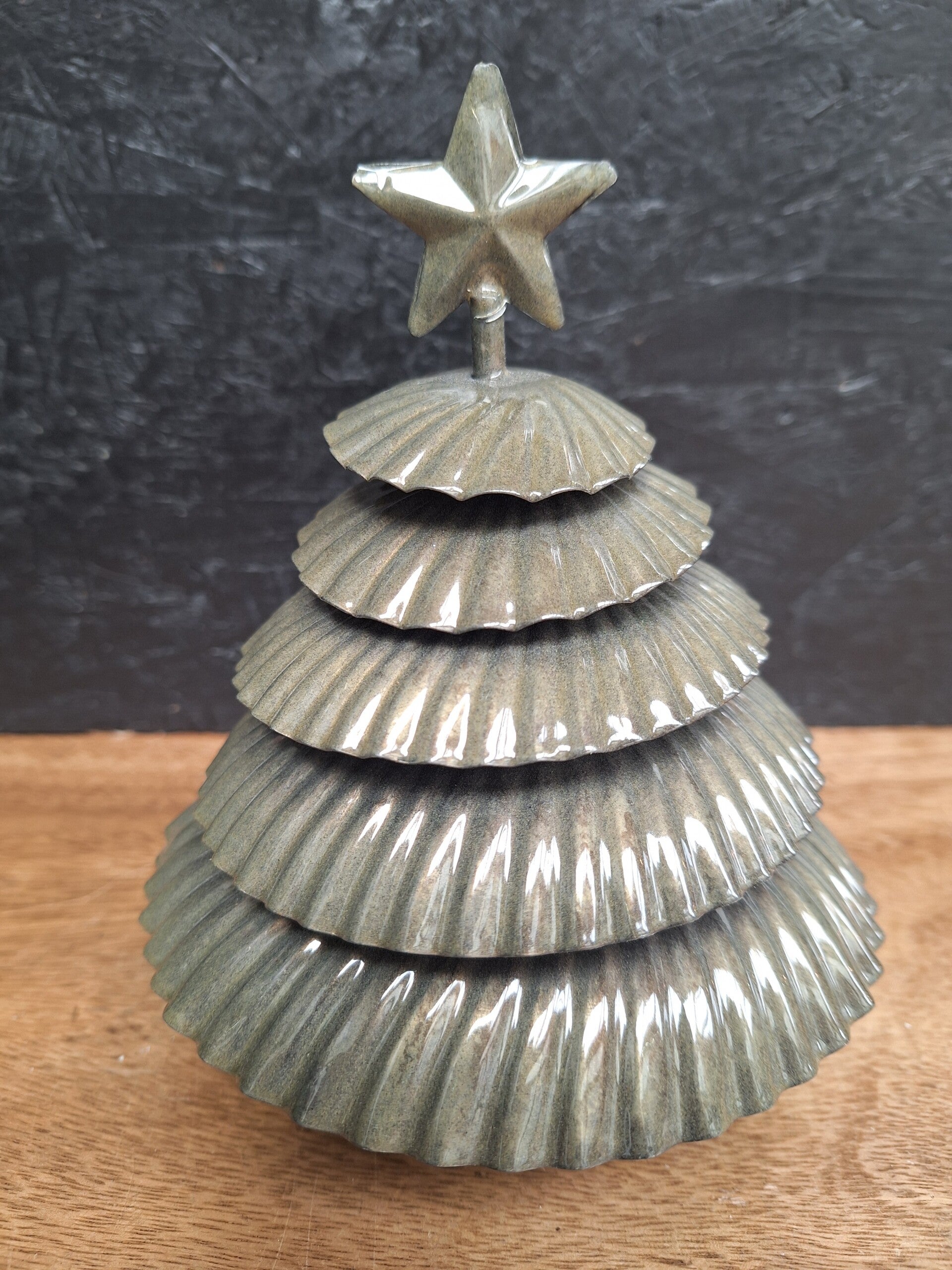 Voeg een stijlvolle touch toe aan je kerstdecoratie met deze metalen kerstboom in de kleuren olive, zwart en peach. Met een afmeting van Ø13,5 x 18 cm is dit decoratieve boompje ideaal voor op tafel, in de vensterbank of als subtiele blikvanger in je interieur. Een moderne en sfeervolle aanvulling op je feestdagen.