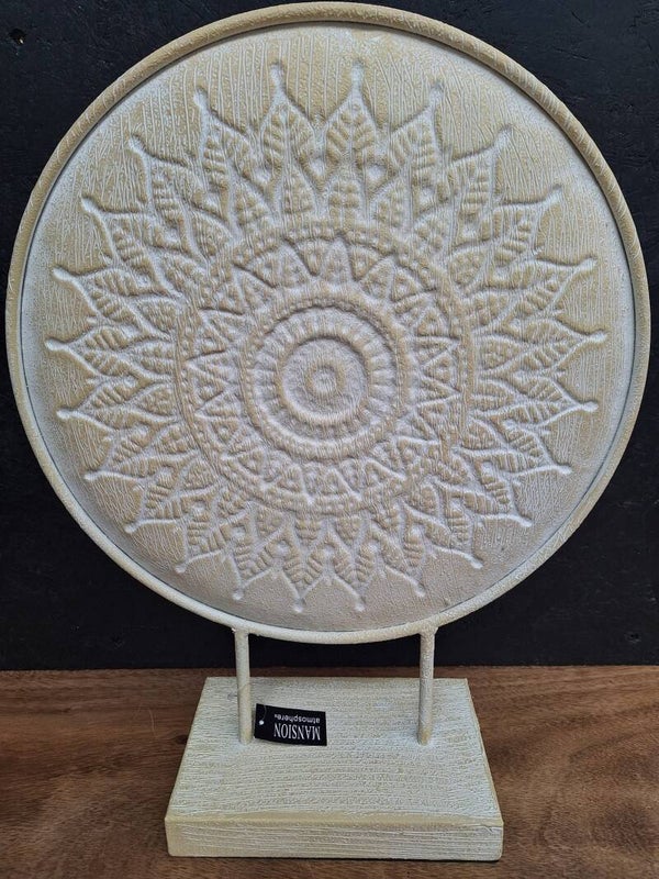 Dit stijlvolle decoratie ornament op voet van metaal in crème is een elegante blikvanger in ieder interieur. De ronde schijf van 35x35 cm rust op een stevige voet en heeft een totale afmeting van 46x35x35 cm, waardoor het ornament mooi tot zijn recht komt op een dressoir, tafel of kast.